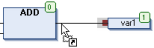 见下图中的例子:在var1元素上单击选中输入引脚,红色矩形显示表示这个连接点被选中。按住鼠标不放,连接到ADD运算块的输出端知道出现如图所示的光标形状。松开鼠标即可建立连接线。