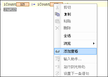此命令在在线模式下上下文菜单中可使用。光标定位在一个标识符时,可以用于任何语言的编辑窗口。通过这个命令将表达式添加到“查看1”窗口。如果“查看1”窗口不存在将会直接打开。如果表达式已经存在窗口中,存在的表达式将会被选中。