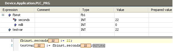 ⇘ 调用函数监视能被用于任何定制,能被看做4字节的数值(如西安,短,长)。对于其他输入参数(如BOOL),一个变量不得不被用来替代一个常数参数。指令'{attribute 'monitoring':='call'}'必须被添加在功能声明的线上。然后在POU联机视图下,一个变量得到一个指定的功能访问结果,这个变量在文本编辑视图下能被监视。为了同样的效果。变量也可以被添加进一个 ⇘ 监视列表。注意你可能使用命令“添加观看列表”为了立刻得到为此目的在一个观看列表中提供的变量。