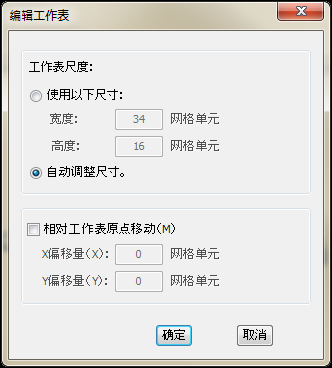 “自动调整尺寸:”默认情况下此选型激活。工作表的大小通过最低部(高度)和最右端(宽度)的边界定义工作区域的大小。原点(X=0, Y=0)位于左上角。