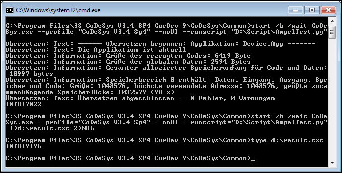 start /b /wait CoDeSys.exe --runscript="D:\Script\AmpelTest.py" --noUI 2>NUL: 除了脚本信息之外的其他信息都将会被禁止 - 脚本信息将会显示在控制台窗口中。